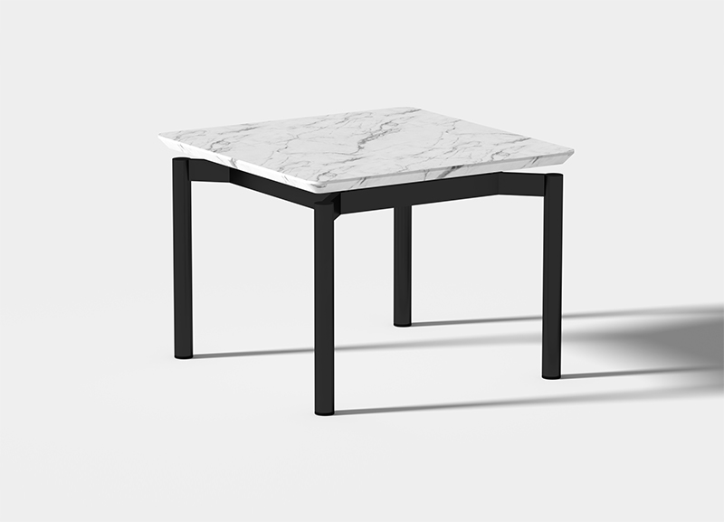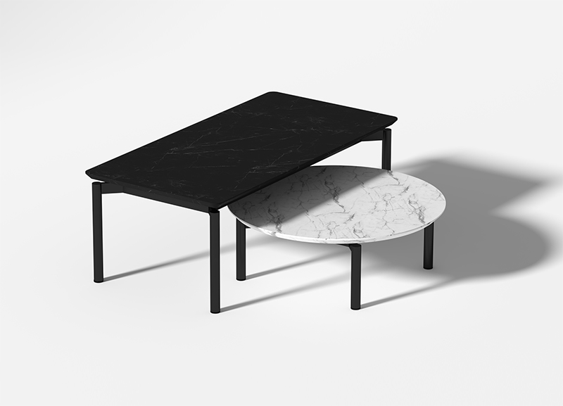 米洛茶几作为米洛沙发的系列产品,沿用了其独特的脚架形式;在极简、百搭的理念下,搭配黑白石纹的岩板台面,形成了极具有漂浮感和建筑感的几何外形。